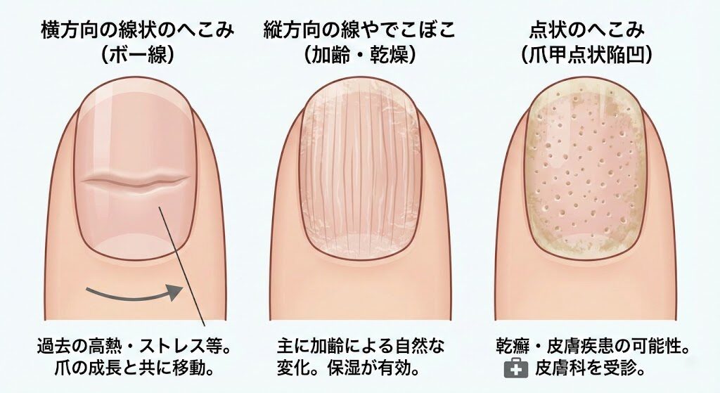 爪は皮膚の一部が変化したもので、ケラチンというタンパク質でできています。爪が作られる過程で何らかの問題が起きると、その痕跡がへこみや凹凸として爪に現れます。