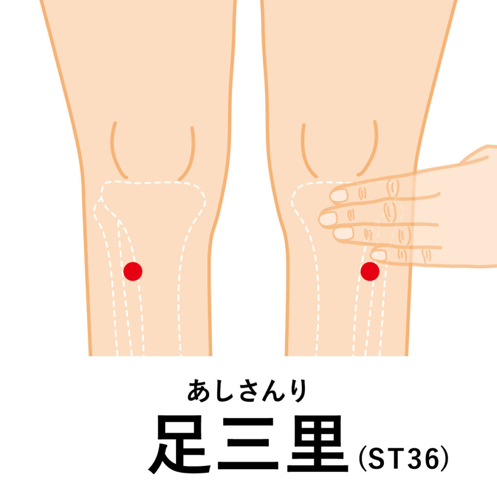足三里は膝のお皿の下にあるツボで、東洋医学で最も重要なツボの一つとされています。膝のお皿の外側下端から指4本分下にあり、すねの骨の外側のくぼみに位置します。